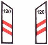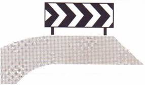 | شاخصة تحذير وإرشاد في منعطف حاد : على سائق المركبة أن يتمهل بالسير ويتابع سيره بالاتجاه الموسوم باسهم على الشاخصة. في الأمكنة التي تنفذ فيها أشغال على الطريق تكون الألوان برتقالي - ابيض. | ||